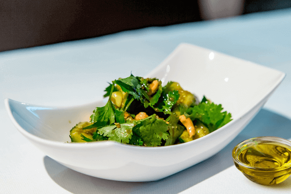 在这道菜中,我们会使用两次西班牙特级初榨橄榄油:烤坚果(先涂上我们的产品,避免粘在烤盘上,同时又能增添额外的味道),还有用于制作沙拉酱:特级初榨橄榄油始终是酱料的基础,在这种情况下,与酱油、米醋和其他调味料混合,让普通的凉拌菜变得更特别。